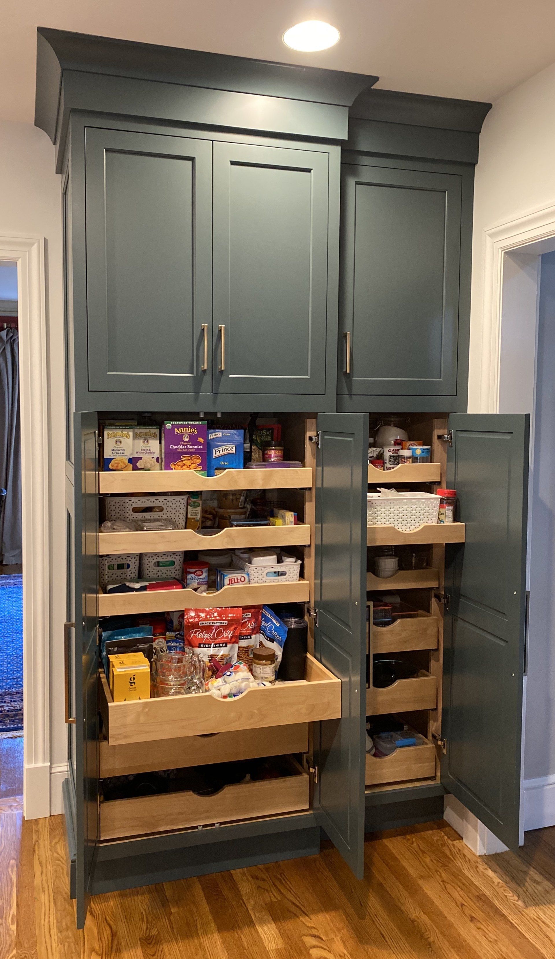 Here we have a traditional home located in Longmeadow, MA with a newly updated Kitchen and Bathroom. Our clients' welcomed the magnificent color of Knoxville Gray into their home with their new kitchen cabinetry. The countertops are made of Quartzite. This top notch cut of natural stone has a green tined grain that ties in perfectly with the rest of the kitchen. There is plenty of storage, as they have a large pantry and tall storage closet. Around the corner from the Kitchen is a stylish half bath with a pedestal sink and a minimalistic checkered floor design.